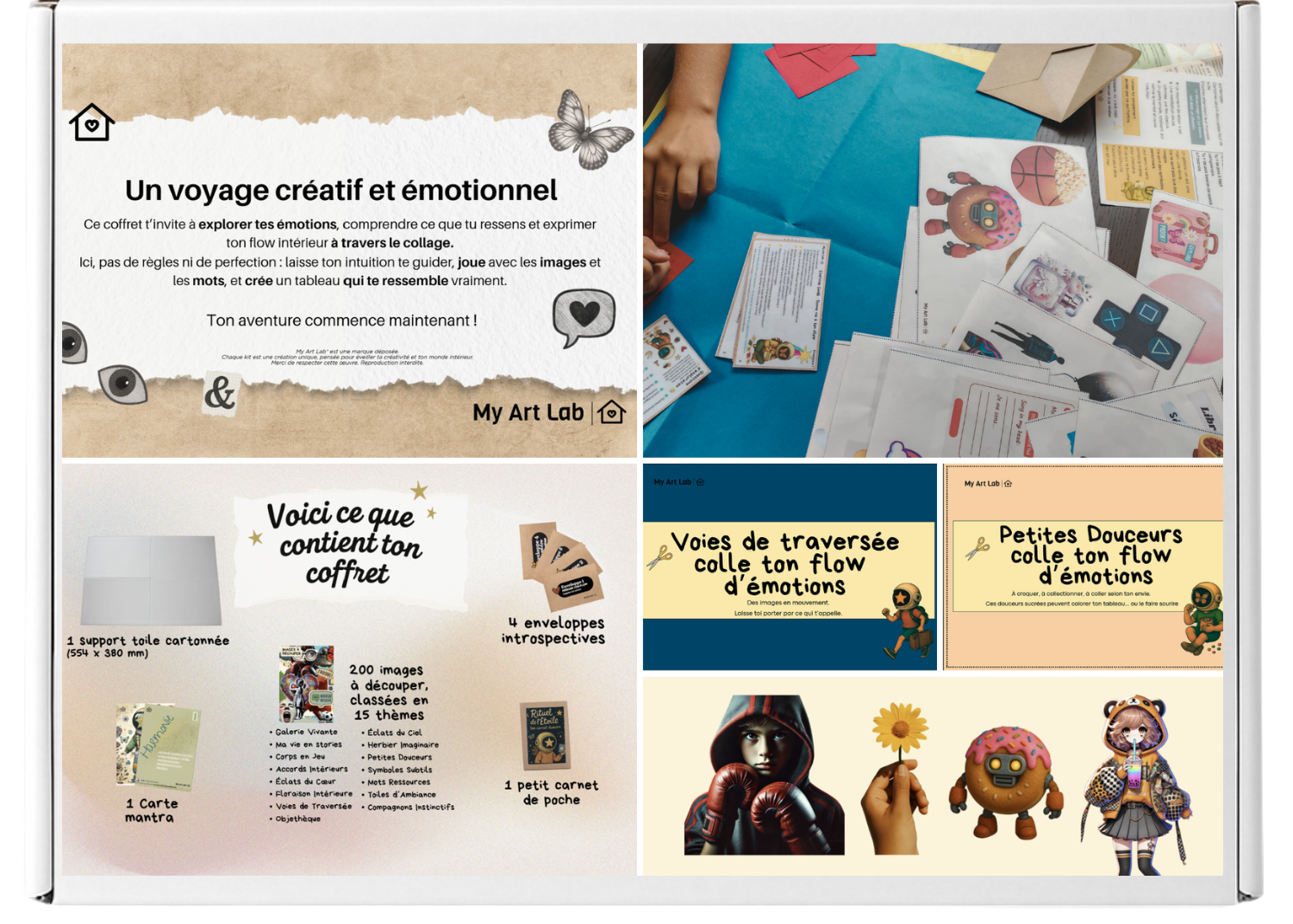 Colle ton Flow d’Émotions est un coffret créatif artisanal destiné aux adolescents de 11 à 14 ans, conçu pour explorer, exprimer et apaiser les émotions à travers le collage.